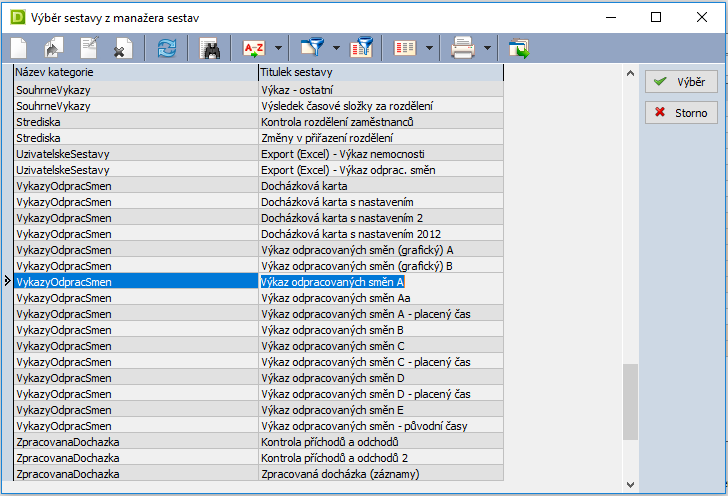 V položce formulář, můžete zvolit v jaké položce docházky se má daná sestava zobrazit. Pokud není vybrán pak je zobrazen standardně v položce pro TISK.